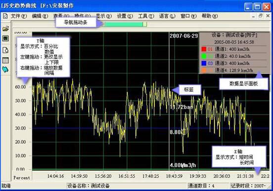 值),時(shí)時(shí)顯示當(dāng)前測量曲線圖、柱狀圖,可查閱歷史數(shù)據(jù),歷史曲線圖。
